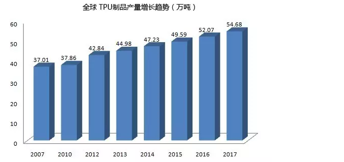根统计,2012 年全球 TPU制品产量达到42.84万吨,预计2013-2017 年全球 TPU 制品市场规模将以 5%的年复合增长率持续增长,2017 年产量预计将接近54.68 万吨。