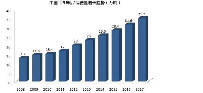 中国是全球主要的 TPU材料生产和消费国,根据中国聚氨酯工业协会统计,我国 TPU 制品消费量从 2007 年的 11.5 万吨增长到2013 年的 23 万吨,年复合增长率为12.25%。中国聚氨酯工业协会预计, 2013-2017年, 我国TPU制品消费量将以11.2%的年均速度增长,到 2017 年消费量预计将达到 35.2 万吨。